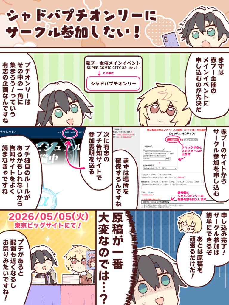 1.赤ブーブー社の『SUPER COMIC CITY 33 -day1-』への申込を行う。